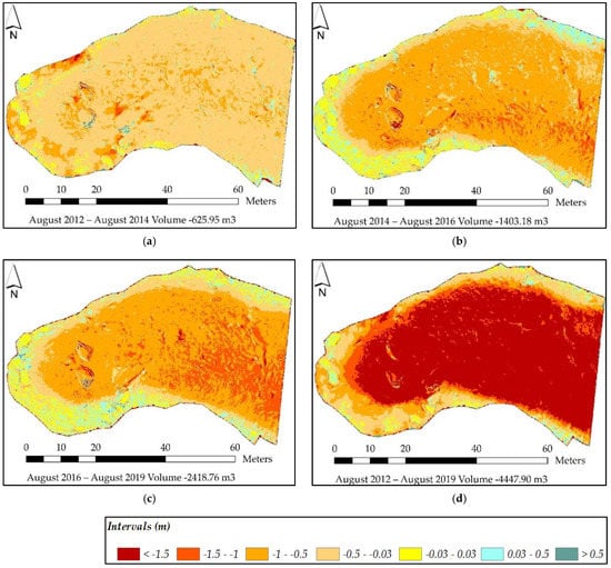 Comparison of digital elevation models: (a) Period 2012–2014. (b) Period 2014–2016. (c) Period 2016–2019. (d) Whole period (7 years) 2012–2019.