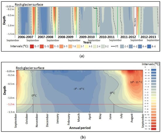 - The thermal regime of the active layer of the rock glacier was determined using the information provided by 5 thermic sensors installed in series at different depths: −0.05 m, −0.20 m, −0.50 m, −1.00 m, and −1.50 m.