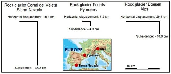 This thermal influence is not so significant in the dynamic of glaciers at other European latitudes, where they behave very stably over the years []. The general dynamic of the Corral del Veleta rock glacier was compared with that of other glaciers in the Pyrenees (Posets) [,,] and the Alps (Doesen) []. These latter rock glaciers were chosen as being representative of their geographical area and having very similar behaviours to those of other rock glaciers studied in the same areas, e.g., the Argualas and Maladeta rock glaciers in the Pyrenees [] and Hinteres Langtankar, Weissenkar, and Goessnitzkess in the Alps (Austria) [,].