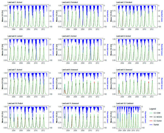 - Evaluate and compare the time series of the AquaCrop simulated maize canopy cover (CC) with the time series of the canopy cover derived from the MODIS-satellite LAI-product (MODIS-CC), whereby AquaCrop is alimented by the available digital soil hydraulic property maps (AquaCrop-CC-DSM).