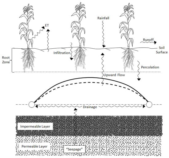 In the second step, the model generates a table correlating the maximum upward flow from the saturated zone to the root zone with the position of the WT, using a finite differences solution of the Darcy equation, with the van Genuchten representation of the soil water retention curve []. The equation used to determine flow upward through any level below the root zone is: