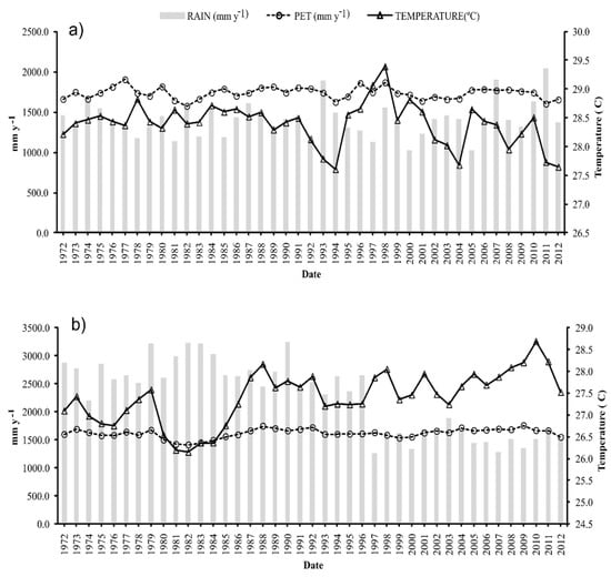 Annual precipitation (mm year−1), PET (mm year−1) and temperature (°C) in the period of 1972–2012 for the Barinas (a) and Turen (b) weather stations.