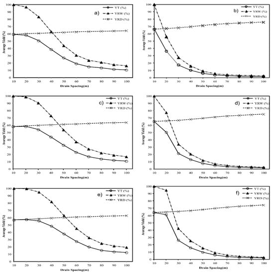 Yield due to excess water (YRW), deficit (YRD) and total (YT) for sugarcane in the period of 1972–2012, for soil 1 for drain spaces varying from10 to 100 m and drain depths of 1.2 (a,b), 1.4 (c,d) and 1.6 (e,f) m for the Barinas (a,c,e) and Turen (b,d,f) weather stations.