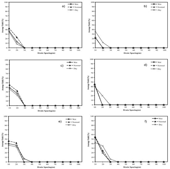 Contrariwise for corn yield, Resende et al. [] observed with SISDRENA that the best drain space for clay and clay loam soil is 20 m and that clay loam soils tended to have a higher productivity and economic return than  clay soil. Even Lisenbee et al. [], using DRAINMOD, found that 40 m was a threshold distance for drain spacing in sandy loam soil, beyond which yields start to decrease due to under-drainage.