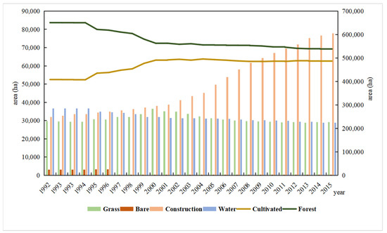 Figure 1. Changes of the forest land and cultivated land areas in Wenzhou City from 1992 to 2015 (left ordinate: grassland, bare land, construction land, and aquatic environments; right ordinate: forest land and cultivated land).