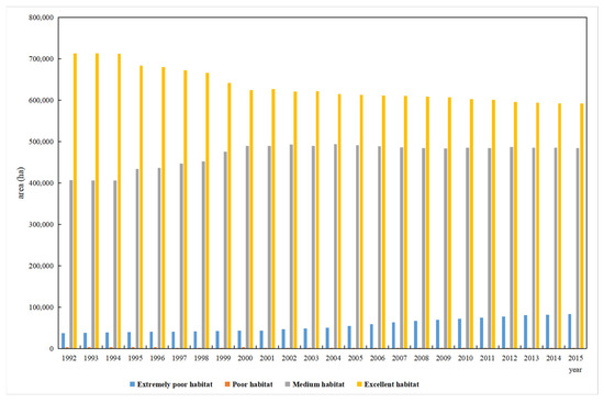 The habitat quality in Wenzhou City was relatively good from 1992 to 2015. The area of excellent habitat quality accounted for the largest proportion of the whole city. However, the area of excellent habitat decreased from 1992 to 2003 and then stabilised at ~610,000 ha. The area of medium habitat quality increased from 406,615.78 ha in 1992 to 491,415.81 ha in 2005 and then remained at the same level. The area of extremely poor or poor habitat quality was smaller. The area of extremely poor habitat quality increased from 37,334.59 ha in 1992 to 83,121.74 ha in 2015. During 1996, the area of poor habitat quality sharply decreased by 2894.69 ha and reached 197.83 ha in 1997. Subsequently, the area of poor habitat quality slightly fluctuated, but did not exceed 307.99 ha (Figure 2).