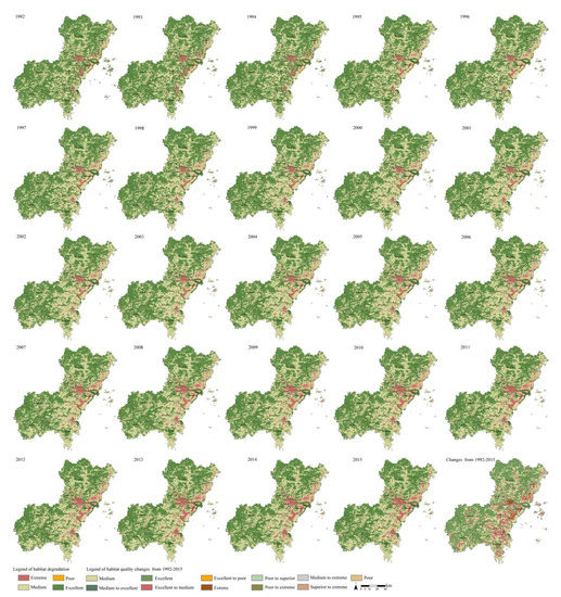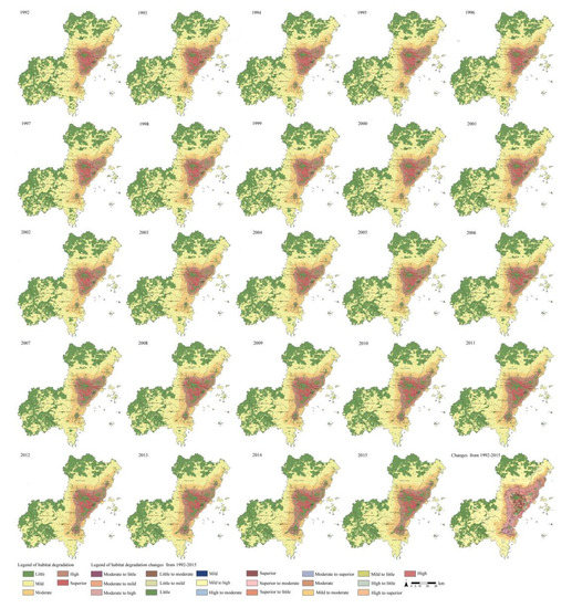 The degree of habitat degradation ranges from zero to one. The larger the value is, the higher the habitat suitability [41]. To explain the changes in the habitat degradation in Wenzhou City, habitat degradation has been reclassified in GIS into five stages: little degradation (0–0.2), mild degradation (0.2–0.4), moderate degradation (0.4–0.6), high degradation (0.6–0.8), and extremely high degradation (0.8–1).