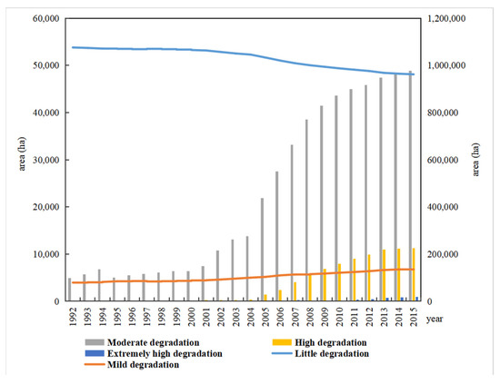 The land area that experienced habitat degradation in Wenzhou City was relatively low from 1992 to 2015. The areas of little degradation accounted for the largest proportion of the whole city. These decreased over the 24 years, whereas areas with the other four types of degradation increased. Areas of moderate degradation grew the most rapidly. In 2015, these areas accounted for approximately ten times their area in 1992. There were no areas with a relatively high degree of degradation from 1992 to 1995, but they began to appear after this time. After 2004, the growth rate of areas with relatively high degree of degradation accelerated and reached ~11,241.60 hectares in 2015. There were no areas of extremely high degradation from 1992 to 2006. These began to appear after 2007 and reached 902.05 hectares in 2015 (Figure 4).