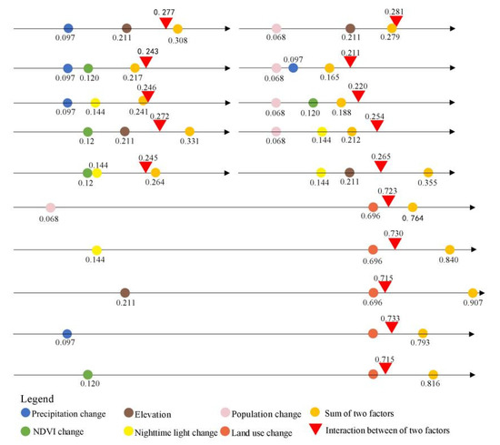 Analysis of the factor interactions (Figure 6) shows that when compared with single factor interaction, the results of the interactions between each impact factor and other factors are enhanced by varying degrees. Land use ∩ precipitation change (0.733) and population density change (0.730) have the largest values, followed by the land use ∩ night-time light change (0.723), land use elevation ∩ DEM (0.715), and land use ∩ NDVI (0.715). The population density change ∩ precipitation change (0.211) showed the least interaction. There is a notable interaction between land use change and other factors. The land use type significantly affected the distribution patterns of different ecosystems. In addition, the increasing frequency of human activities led to an accelerated transformation of land use types, which increased the ecological pressure of surrounding towns and sped up changes in habitat quality. The interaction among anthropogenic factors was stronger than among natural factors, although natural factors are the foundations of habitat quality; they change slightly with weak intensity. Obvious changes in natural factors such as elevation would not occur without the disturbance of human activities. Therefore, the pairwise interaction among the anthropogenic factors is stronger than that among natural factors or between natural factors and social-economic factors.