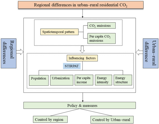 In the paper, RCEs were accounted for from the urban–rural perspective at the provincial level. We investigated the relationship between socioeconomic indicators (population size, urbanization, income per capita, energy intensity, and energy structure) and emissions by the STIRPAT model. We further analyzed the regional and urban–rural differentiation of influencing factors from the gradient distribution of regional development level, the agglomeration effect of urbanization, and the forced mechanism of western ecological policy. The main conclusions of our study are as follows: