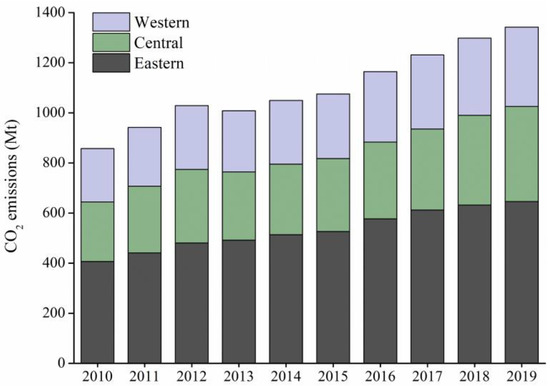 The above-mentioned gradient regional development exists in the eastern, central, western regions, and urban–rural areas of China. At the regional level, the eastern region is more economically developed due to the priority of opening to the outside world. The eastern region bears the bulk of the population and economic activities in China. Beijing–Tianjin–Hebei, Yangtze River Delta, and Pearl River Delta, the three major urban agglomerations, are all located in the east of the country, which are China’s three major urban agglomerations. Therefore, the CO2 emission of residential energy consumption in the eastern region is significantly higher than that in the central and western regions. Similarly, compared with rural areas, advanced urban areas are the main carrying part of population and economy. Residents’ living standards are higher than those of rural areas, and urban areas are the main contribution area of total emissions.
