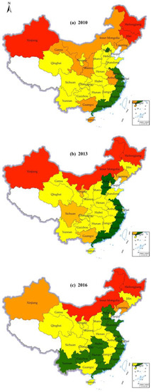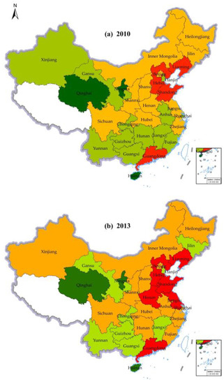 Chinese RCEs have been steadily increasing, with emissions accounting for 857.21 Mt in 2010 but 1342.04 Mt in 2019. National RCE can be divided roughly into two stages according to the annual rate of change. From 2010 to 2012, CO2 emissions increased steadily, decreased in 2013, then continued to increase until the end of the study period (Figure 3). (The Figures show 2010, 2013, 2016, and 2019 in terms of the phased characteristics of RCE growth and the equalization of time intervals.) From a regional perspective, though the RCE in all regions increased overall, the rates of growth presented regional differences. The eastern region was the main contributor to RCE, accounting for the highest proportion of 46.68–49.71%, followed by the central region (26.27–28.53%), and then the western region (23.56–24.94%) during the study period. The incremental increase in RCE of the central region was the largest (59.91%), followed by that of the eastern region (58.86%), and western region (48.44%). At the provincial level, Henan, Anhui, Hunan, and Jiangxi provinces in the central region experienced substantial growth during the study period and RCE in Hainan Province in the eastern region also increased substantially. Among the western provinces, Xinjiang Province increased significantly (Figure 4).