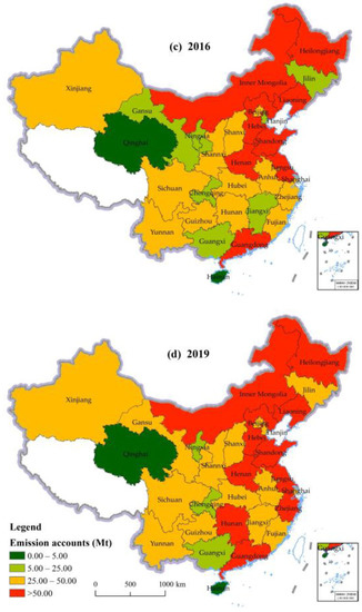 Figure 4. Spatial patterns of RCE in China in 2010 (a), 2013 (b), 2016 (c), and 2019 (d) (unit: Mt).