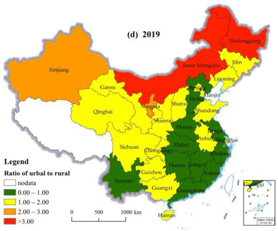Figure 5. Spatial distribution of ratio of urban to rural per capita RCE in China in 2010 (a), 2013 (b), 2016 (c), and 2019 (d).