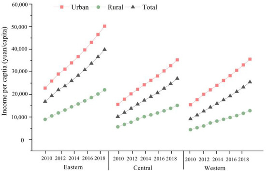 Figure 6. Changes in per capita income of urban and rural residents in the three different regions of China during 2010–2019.