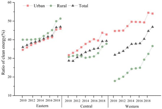 The Chinese government has issued a series of energy policies since 2013. In regions where heating based on natural gas cannot be achieved, new energy sources such as electricity and solar energy are being used instead. Moreover, various localities have continued to introduce detailed policies to promote the reform of the energy structure of residents’ living conditions. The proportion of coal consumption to total residential energy consumption has been declining [54]. Obvious regional differences exist in the energy consumption structure of different regions of the country. On the whole, the proportion of natural gas and electricity of total residential energy consumption in various regions has been rising (Figure 8). The proportion of clean energy in the western region increased the most, followed by that of the central region, and that of the eastern region.