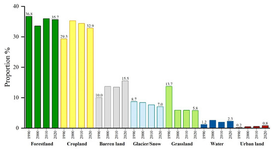 The land-cover changes in the GRB from 1990 to 2020 are shown in Figure 2. Forestland and cropland are the dominant land cover types in the GRB, together consistently accounting for greater than 60% of the area. Distinct trend changes occurred over the whole study period in the various land cover types at different times. In general, forestland, glacier/snow and grassland showed a decreasing trend, while the remaining land cover types showed an increasing trend. During the study period, bare land experienced the largest percentage increase from 10% in 1990 to 15.5% in 2020. Still, the land type with the highest rate of change (area in 2020 divided by area in 1990 minus 1) was urban land, and grassland experienced the largest decrease of about 7.9% (accounting for the whole study area). In addition, the different land cover types have distinctive phase traits. For 1990–2000, forestland showed a decrease, while cropland showed a marked increase in the same period. The forestland area gradually increased after 2000, while the cropland proportion steadily decreased every decade. Furthermore, the glacier/snow area continuously declined throughout the study period, decreasing by an average of 250 km2 per decade. In contrast, urban land increased every period, averaging about 91 km2 per decade.