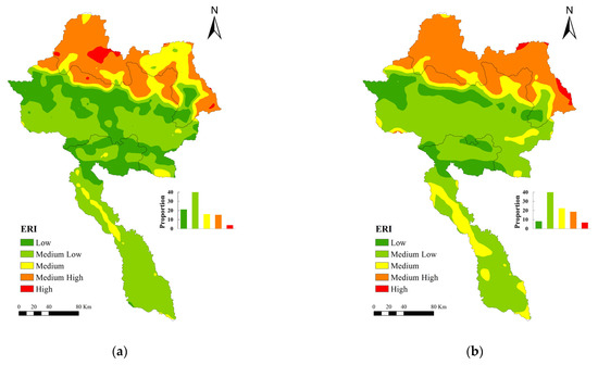 In order to better represent the distribution patterns and spatial heterogeneity of ecological risks within the GRB, the grid with a width and height of 6 km was applied to spatialize the ecological risk index, regarding existing studies and the local situation of landscape patches in the study area [76,77]. Total of 1411 assessment units were sampled using an equal distance sampling approach. Then, the ERI for each sample area was assigned to the ecological risk value at the center of the sample area. Furthermore, to identify the spatial characteristics of the ecological risk of the GRB, we mapped the spatial distribution of ecological risk in the landscape based on the level of ERI for each assessment unit using the ordinary kriging method in the ArcGIS 10.4 geostatistical analysis tool. Some studies have indicated that the natural breakpoint method has high grading accuracy and also takes into account the balance of extreme differences in index intensity at all levels, with better integrated mapping results [31]. Therefore, this method was employed to classify ERI into five grades: low risk (ERI ≤ 0.117), medium low risk (0.117 < ERI ≤ 0.150), medium risk (0.150 < ERI ≤ 0.201), medium high risk (0.201 < ERI ≤ 0.263) and high risk (0.263 < ERI).