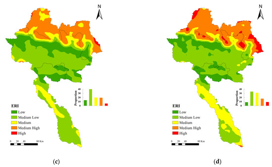 The spatial distribution of ecological risk index in Gandaki River Basin in 1990 (a), 2000 (b), 2010 (c) and 2020 (d). The inset histograms show the proportion of ERI with different class; the legends are consistent with the map legends.