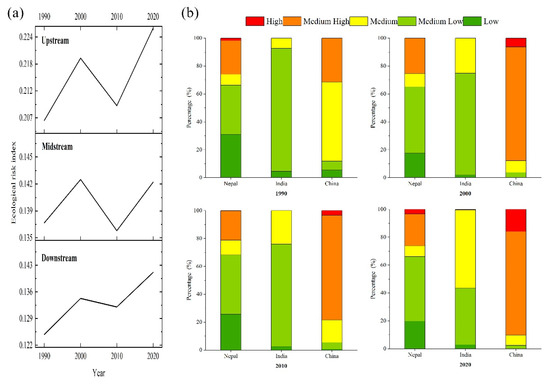Ecological risk in GRB from 1990 to 2020: (a) sub-basin change trend, (b) percentage change in Nepal, India, China.
