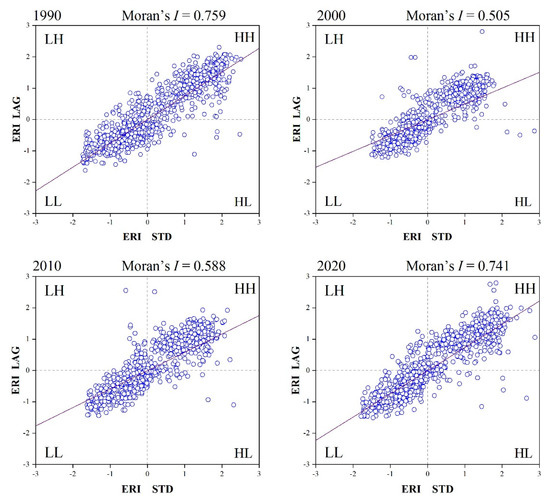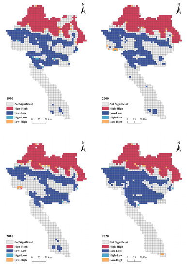Moran’s I was applied to conduct the global spatial autocorrelation analysis of ecological risks to explore the clustering characteristics of ecological risks, and the results are presented in Figure 5. The Moran’s I reached 0.76, 0.51, 0.59 and 0.74 in 1990, 2000, 2010 and 2020, respectively. Moran’s I values were higher at each phase, indicating a significant positive spatial clustering effect of the GRB ecological risk index over the 30-year period. That is, the ecological risk grades at most landscape scales are similar to the risk levels in their surroundings. In addition, there were fluctuations in the values of Moran’s I, as it showed a certain decline from 1990 to 2000 and a gradual increase after the 2000s. This phenomenon suggested that before 2000, land-cover change mainly contributed to the increased spatial heterogeneity of landscape ecological risk. While patches with similar levels of landscape ecological risk continued to spread after 2000, the spatial aggregation effect increased substantially and positive spatial correlation became the prevailing characteristic of the GRB. However, compared to 1990, the values of Moran’s I were lower in 2020, which further indicated that the factors influencing changes in ecological risk in the GRB tended to be more diverse.