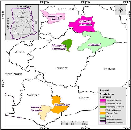 This study was conducted in six districts, namely, Kintampo South, Atebubu Amantin, Mampong, Sekyere Afram Plains, Wassa East and Tarkwa districts (Figure 1).