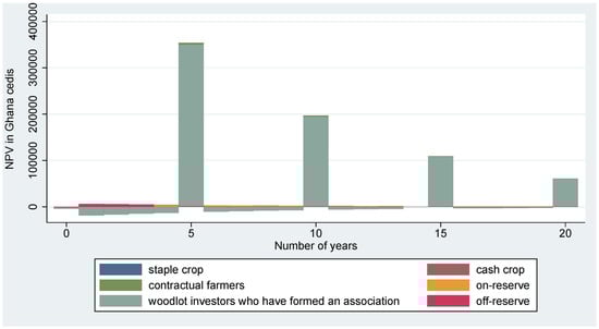 Woodlot investors in associations have the lowest NPV and BCR values. This is because they contribute each month and ensure that every member is at par. Funds are generated internally to run the administrative cost of the association. These investors do not enjoy a fixed price or government subsidies, resulting in a low NPV. Investors without any contractual agreement have the lowest NPV and BCR values, except for those in associations. This confirms [5] findings that the forest does not generate sustainable revenue for investors. Their sales are low because of the low-quality timber logs they produce. They usually burn their lands each year. This is because they do not receive any incentive to pay labor costs or to buy weedicides to spray on the land. Soil [29] and wood quality are lost through the burning of forest lands each year; thus, people buy timber logs for as low as GHS 10. The comparison of woodlot production without any contractual agreement, with staple and cash crops, showed that staple and cash crops are more profitable than woodlot production. This is because farmers receive GHS 28,329.53 and 23,557.22 more in terms of NPV in staple and cash crops, respectively. This explains why farmers cut down timber trees on their cocoa farms [30]. Trees compete with staple and cash crops for space and nutrients, but provide less revenue to the farmer. This highlights the difficulties in agroforestry in Ghana.