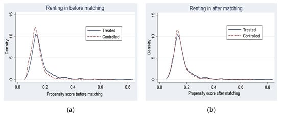 Common support assumption test for renting-in land density distribution of p-scores before and after matching. (a) Renting in before matching; (b) Renting in after matching.