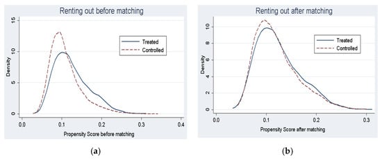 Common support assumption test for renting-out land density distribution of p-scores before and after matching. (a) Renting out before matching; (b) Renting out after matching.