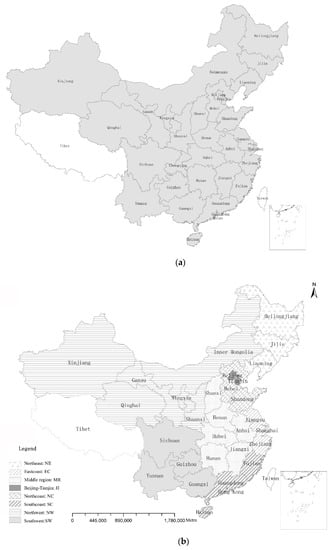 Research area. (a) 30 provinces studied, (b) 8 subnational regions.