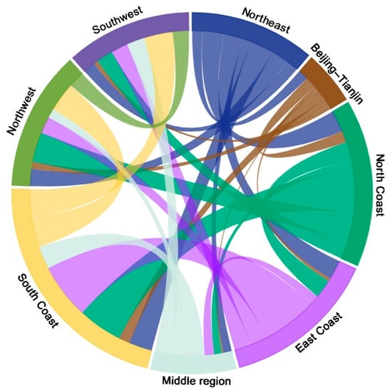 To explore the embodied agricultural land transfer relationship between regions more intuitively, according to the above regional division standard, a diagram of the transfer of embodied agricultural land between regions was drawn (Figure 3). The different colors in the figure represent the eight regions, and the relationship zone corresponds to the embodied agricultural land transfer area and transfer volume. From the perspective of the transfer of agricultural land footprints in each region, the central, northeast, and northwest regions had the highest transfer-out volumes of agricultural land (62.53, 34.23, and 30.74 million ha2, respectively), making them, collectively, the main source of embodied agricultural land. The eastern and northern coastal regions, meanwhile, were the regions with the highest transfer-in volumes of agricultural land (44.78 and 37.36 million ha2, respectively). They mainly played the role of embodied agricultural land “consumers” in inter-regional trade. The central region was not only the main source but also the main “consumer”, but the scale of transfer-out was much larger than the scale of transfer-in, so it was still one of the most important embodied agricultural land “suppliers”. Since primary industry accounts for a relatively low proportion of the economic structure in areas with higher economic levels such as coastal areas and Beijing–Tianjin, the scale of agricultural land transfer-out was small, and the agricultural land footprint was mainly derived from external sources, representing the main embodied agricultural land “consumption”. From the point of view of the net transfer of agricultural land in each region, the Beijing–Tianjin area and northern, eastern, and southern coastal areas were net transfer-in areas, and the northeast, central, northwest, and southwestern areas were net transfer-out areas. The overall direction of the net transfer of land showed a trend from north to south and west to east, which specifically manifested in a shift from the underdeveloped areas in the central, western, and northeastern regions to the Beijing–Tianjin area and the developed coastal areas. For example, central and western regions such as Henan, Hunan, and Xinjiang were transferring agricultural land to Beijing, Tianjin, Shanghai, Jiangsu, Zhejiang, Guangdong, Shandong, and other regions. At the same time, northeast regions such as Jilin and Heilongjiang were also important agricultural land transfer-out areas. In general, areas with higher economic levels were mostly agricultural land transfer-in areas, and areas with relatively low economic levels were mostly net-out areas.