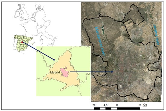 The city of Madrid is in the centre of the Iberian Peninsula and the Central Plateau, (40°25′00″ and 3°42′00″), occupying an extension slightly greater than 600 km2 and a resident population of around 4,500,000 inhabitants (Figure 1). Topographically, it occupies a flat to undulating surface (with small hills and elongated troughs), with an average altitude of 655 m.a.s.l., reaching the highest point in the north of the city, (740 m.a.s.l.), and the lowest in the southern limit, (554 m.a.s.l.). This territory is in the “Campiña” countryside, a transition area between the Sierra de Guadarrama and the Madrid basin, on tertiary Neogene materials, of a detrital nature in the north and centre (arkoses, sands, clays and silts), and mostly of chemical origin to the south and southeast (marls, gypsum, gypsum marls, including sepiolite and flint) [33]. It is constituted by small hills and elongated troughs, with a dominant NS direction, which other authors have already analysed in their influence on the urban climate of Madrid [34].