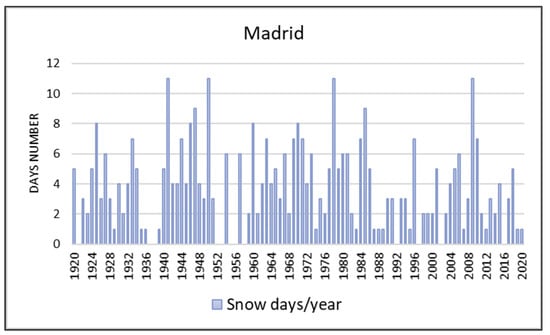 The period with probability of snowfall in Madrid in the last century (1920–2020) occurs from October to April, with a reduced average annual number of days (3.8), but with maximums that reach 11 days/year (1941, 1950, 1978 and 2009) and another 11% of years without snow (Figure 2).