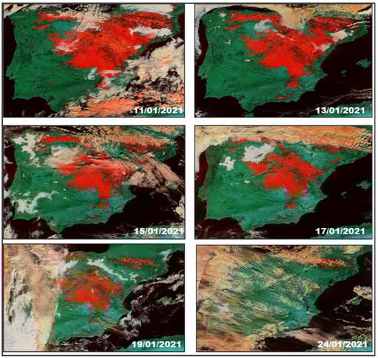 The first consequence of Storm Filomena was the extraordinary snowfall, both in extent and in thickness. The general approximation of the snow extent reached in the Iberian Peninsula after the passage of Storm Filomena can be followed through the MODIS/Terra satellite images (Figure 3). The visual interpretation in false colours is very expressive, especially when combining the visible and mid-infrared channels. Of the many possible false colours, the 3-6-7 (R-V-A) band combination easily discriminates snow in bright red, easily differentiating it from cloudiness in white-orange tones and from the snow-free surface in green.