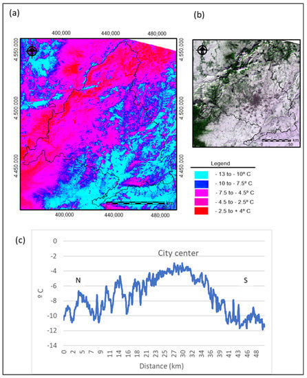 In the municipality of Madrid, temperatures ranged from the minimum, −11 to −10 °C, in forest areas and bare soils (cyan tones), to the least low occurring in the central district, with −3.5 to −5 °C (pink tones and reddish) (Figure 4). Despite the exceptionally cold values reached on those days, the thermal pattern of the “heat island” of Madrid remains, meaning that the less rigorous values appear in the centre; by contrast, the lowest ones appeared in the forest spaces and in the highest districts of the city [53]. These lower temperatures of the urban green enclaves [15,21,54] exceptionally low on these dates, will have a clear negative impact on the forest of the municipality of Madrid.