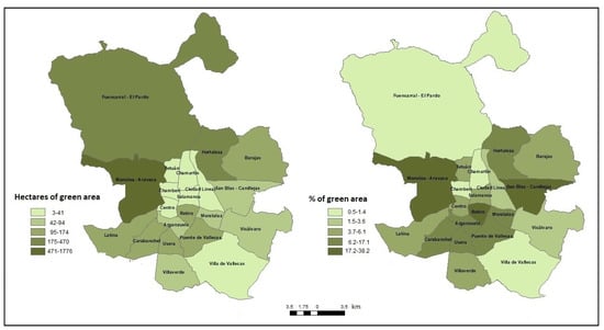 Absolute and relative green space in the districts of the municipality of Madrid. Source Ayuntamiento de Madrid [51].