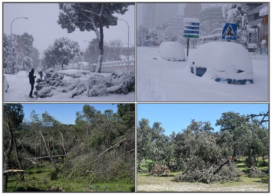 Snowfall is a common meteorological phenomenon and a pervasive global hazard. Snowfalls are relatively common, natural and occasional hazards in the Madrid region, where they rarely affect human lives and have limited direct impacts. However, events such as those experienced in January 2021 can sometimes happen. Compared to open-land areas, tree areas intercept snow, which means that snow cover in tree areas tends to be comparatively lower. This fact generates a decrease in the level of evaporation, while there is a greater winter snowmelt under the canopy [4], a process that took special relevance in the case study (that we have been able to verify directly). According to Link and Marks [5,6], variation of forest canopy leads to uneven interception and to small-scale spatial variation in snow accumulation beneath the forest canopy.