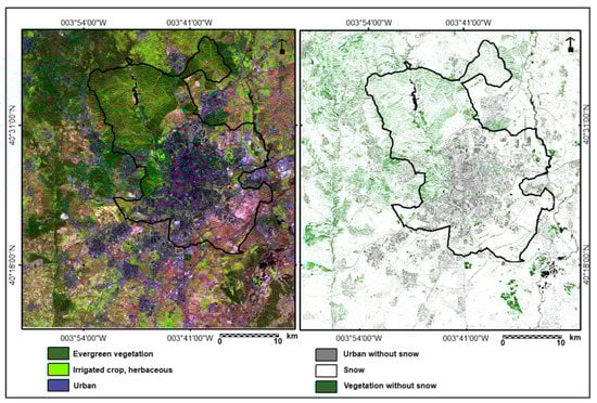 In the image of 1 November 2021, the surface of the Madrid metropolitan area is divided into three categories: snow cover (white), buildings and road infrastructure (grey tones) and snow-free vegetation (green tones). In this image it can be seen that part of the wooded area is free of snow, since initially it is retained in some branches, which in many cases do not support the additional weight and end up falling, sometimes dragging the entire tree. However, the great extension of the snow cover is visible throughout the municipality of Madrid, which affected both the forest areas and the peri-urban fringe, with the lowest surface temperatures (−11 to −7.5 °C), as well as the interior of the city since it also remained below zero for more than a week (Figure 4 and Figure 7).