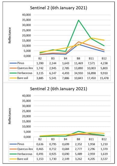 Figure 8 shows the high contrast in the values of all the spectral signatures, before and after the Storm Filomena. The decrease in reflectance values is due to the loss of plant mass and the increase in soil moisture. However, the profiles corresponding to the vegetation maintain in both cases the highest values in the near infrared (band 8). Likewise, the profile of the bare soil maintains the maximum reflectance in the mid-infrared (bands 11 and 12).
