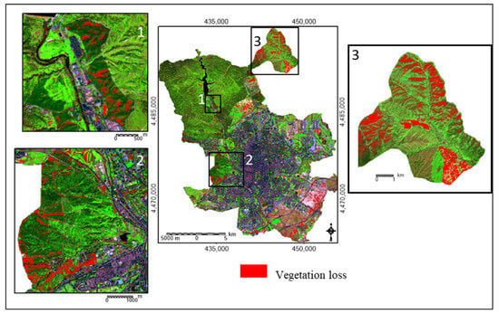 Loss of vegetation in the municipality of Madrid and details in different sectors, obtained through the image of changes in the NDVI between February 2020 and 2021. 1: Repopulation pine forests of Monte de El Pardo. 2: Repopulation pine forests of Casa de Campo; 3. Holm oak and pine forests to the north of the municipality. Sources Copernicus Sentinel Hub [48].