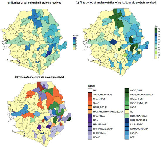 Description of Sierra Leone’s chiefdom-level agricultural aid projects from 2001 to 2015. (a) Number of agricultural aid projects received; (b) Time period of implementation of agricultural aid projects received; (c) Types of agricultural projects received (locations in white are Western Area Urban and Western Area Rural, which are not chiefdoms. ILCSSSDRC: Improving Living Conditions and Strengthening of Social Stability and Decentralization in Rural Communities of Former Civil War Areas in Southern Sierra Leone; PAGE: Promoting Agriculture, Governance and the Environment; RRA: Refugees in Rural Areas in Sierra Leone; RFCIP: Rural Finance and Community Improvement Project; SNAP: Sustainable Nutrition and Agricultural Promotion; EWSPD: Empowering Women for Sustainable Peace and Development; DFP: Diversified Food Production; No: do not receive any types of agricultural aid.)