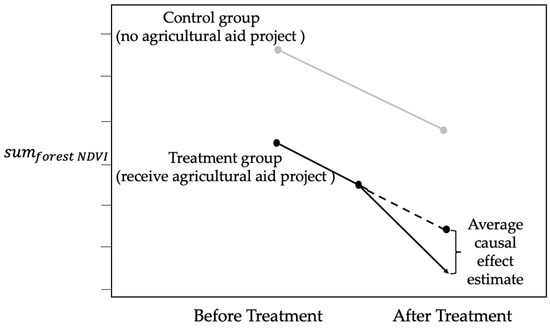 To investigate the impact of agricultural aid on forests, the study used a difference-in-difference (DID) approach, which is a quasi-experimental design that makes use of longitudinal data from treatment and control groups to obtain an appropriate counterfactual to estimate a causal effect [79,80,81,82,83]. The treatment group receives a specific intervention, while the control group does not. The effect of the intervention is estimated by comparing the changes in outcomes over time between the treatment and control groups (Figure 3). The advantage of the DID approach is that it applies the logic of natural experiment, thus makes it possible to avoid the interference of omitted or unobserved variables and prevent endogeneity problems, such as reverse causation caused by a selection bias. In this study, receiving or not receiving agricultural aid projects was a quasi-experimental intervention.