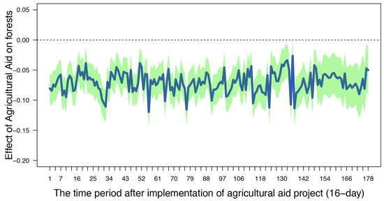 Figure 4 presents the results from the difference-in-difference analyses based on Model 2 for each 16-day time point. We found that there is no shift in the relationship between agricultural aid and forest growth. Agricultural aid negatively and significantly influences forest growth in both the short term (i.e., 16-day frequency) and long term (i.e., years). After about 70 months, the error bounds (i.e., the shaded green areas) are slightly larger than earlier time periods. This may be due to the fact that the number of observations is not large enough to reveal reliable empirical evidence about the causal effect since not many agricultural aid projects last this long. In sum, our results show that the impact of agricultural aid on forest growth is negative and highly significant across time, and a turning point does not appear at least during the period of implementation of agricultural aid from 2001 to 2015.