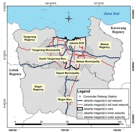 The core of the Jakarta megacity is Jakarta special capital region (SCR), while the Bodetabek region (an acronym for Bogor-Depok-Tangerang-Bekasi municipalities/regencies) is the suburb/hinterland of this megacity [5,8]. The 2020 Indonesian census found that the population in the Jakarta megacity core was 10.56 million people, and in the Jakarta megacity suburbs was 20.68 million people. In some research, the suburban region of the Jakarta megacity is divided into two regions, namely Jakarta megacity’s inner suburb and outer suburb—the region with “municipality (city)” or “kota” status is the inner suburb, while the region with “regency” or “kabupaten” status is the outer suburb [3]. The core and suburb/hinterland area is a feature of the nodal (functional) region system [43,44].