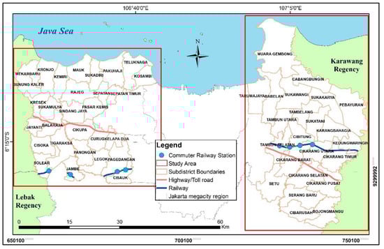 The Indonesian census in 2020 found that the population in the Bekasi and Tangerang Regencies was more than six million people. The Bekasi and Tangerang Regencies have 52 subdistricts (kecamatan); 29 in the Tangerang Regency and 23 in the Bekasi Regency. The analysis unit used in this study was the village (desa/kelurahan), with the Bekasi Regency comprising 187 villages, and the Tangerang Regency comprising 274 villages.