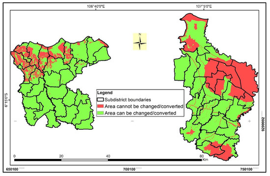 In this study, areas planned (according to Bekasi and Tangerang regencies’ spatial plan) as protected forests (including mangrove areas), open green spaces, parks, agricultural land, river borders, coastal borders, and water bodies (rivers and lakes) should not be changed/converted. Areas that can be changed/converted and cannot be changed/converted are presented in Figure 3. This study also involves some driving factors in LUC prediction related to LSIEP and residential area development, namely: (1) proximity to LSIEP locations, (2) proximity to toll road gates, (3) proximity to main roads, and (4) proximity to the commuter railway station; these are the main driving factors of land (rural to urban) transformation/changes in Bekasi and Tangerang regencies (see [3,8,10,13,48,49,50,51,52,53]). All types of data are presented in Table 1.