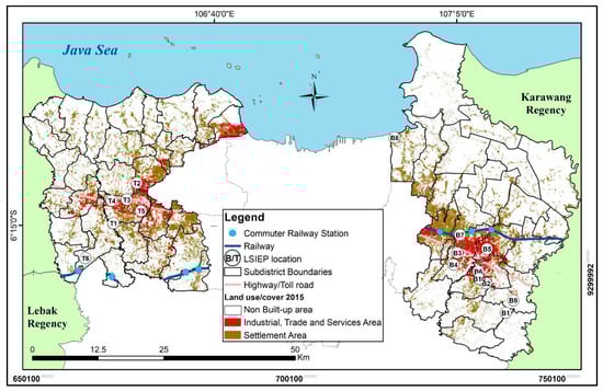 The LSIEP developments have triggered significant urban land developments, especially after decentralization was implemented. According to [24], from 1995 to 2012, dry and agricultural land conversion significantly occurred in Jakarta’s suburbs, especially in Bekasi and Tangerang regencies. Most of the agricultural areas in these regencies have been converted into industrial and settlement areas [2]. The rapid land conversion also led to the “chaotic” patterns of urban-rural land and caused imperfections in the RULT [4,5].