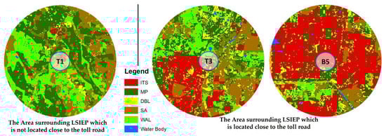Most LSIEP locations are concentrated close to Jakarta megacity’s toll road network (JMTRN); only LSIEP with codes B1, B8, B9, T1, and T6 are not located in those locations (see Figure 6). The LSIEP with codes B1, B8, B9, T1, and T6 are located in areas surrounded by agricultural land that is not built-up area yet. In contrast, the LSIEPs are close to the JMTRN, surrounded by SA (e.g., T3 and B5, see Figure 7).