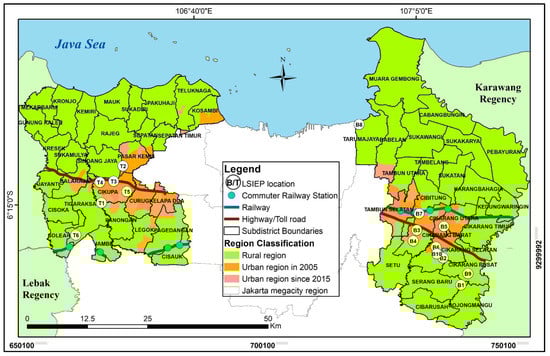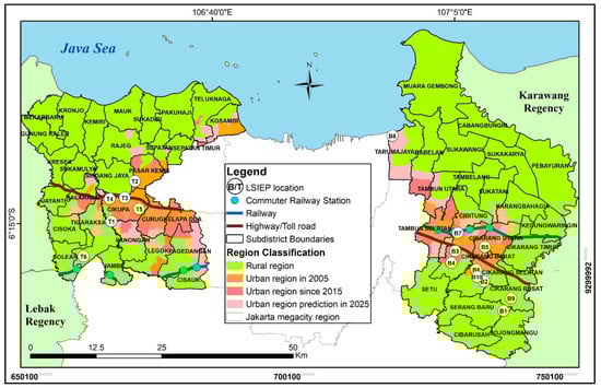 The RULT map produced by this study illustrates the relationship between RULT and the driving factors used in this study (see Figure 10). For example, most urban land in the Bekasi Regency had the following characteristics; close to the commuter railway station, close to primary and secondary roads, and close to the LSIEP locations. However, proximity to the commuter railway station was not the main factor for the rural to urban transformation in the Tangerang Regency (see Figure 10).
