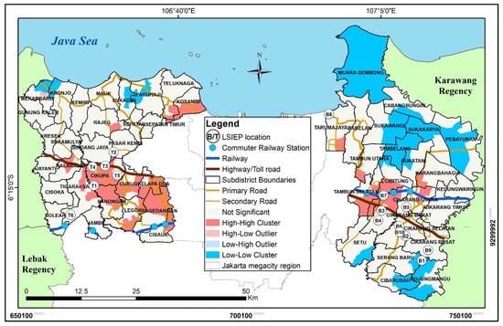 The LISA results derived from ArcGIS (ESRI, Redlands, CA, USA) showed that from 2005 to 2015, the villages that had significant index value increases tended to be close to the location of LSIEP, the toll road gate, primary and secondary roads, and commuter railway stations; as indicated by high-high clusters (see Figure 9). In contrast, villages far from those locations have a low or almost no change in index value difference, as indicated by the low–low cluster. The proximity to primary/secondary roads and commuter railway station factors are the main driving factors for the rural to the urban transformation process in Bekasi Regency. In comparison, the proximity to LSIEP location and primary/secondary roads have more influence on the transformation from rural to urban regions in the Tangerang regency (see Figure 9).